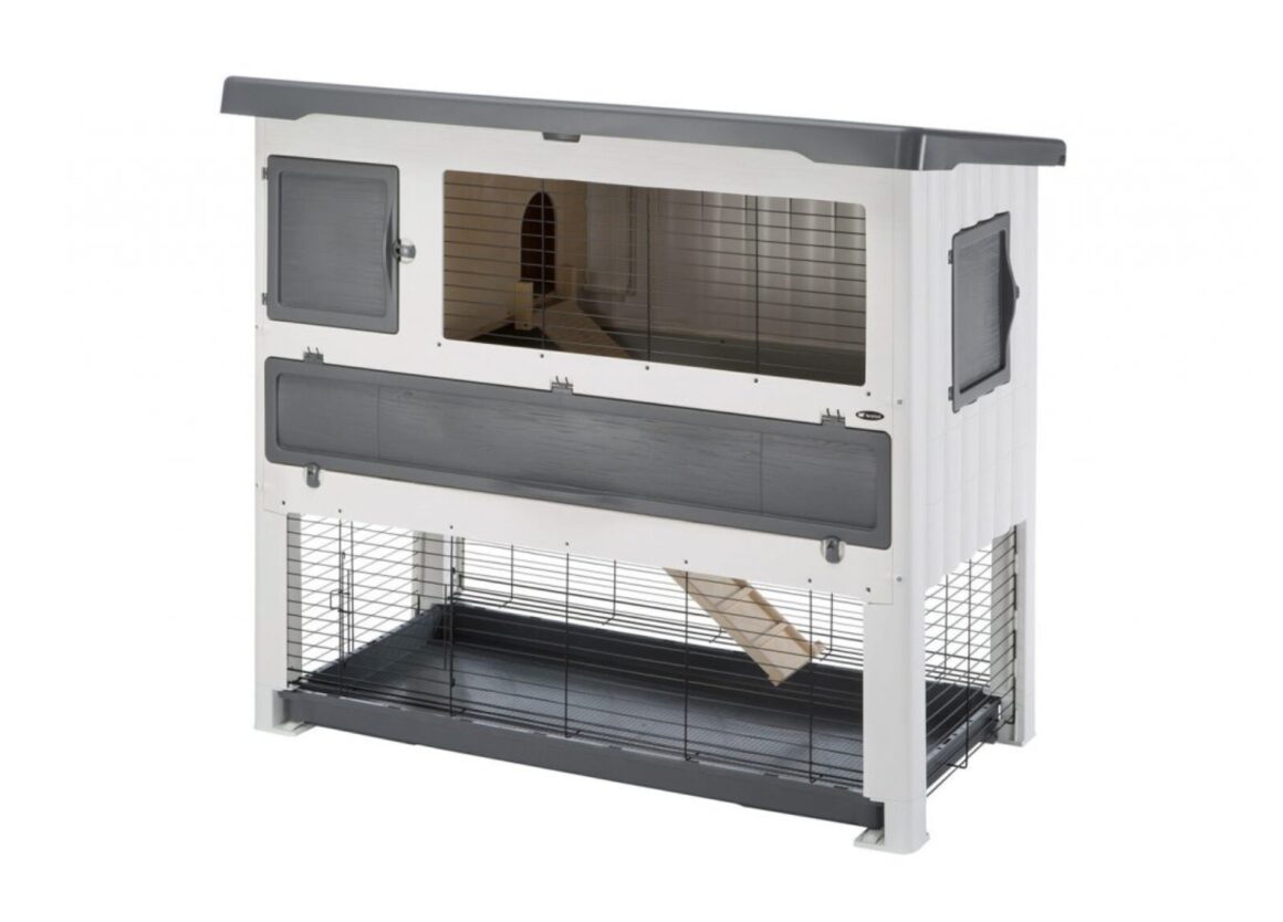 Dit konijnenhok is voorzien van een nachtverblijf, een overdekt verblijf en een ren. Dit hok is geschikt voor zowel buiten als binnen. Het konijnenhok heeft een handige lade waarmee je de bodembedekking eenvoudig kunt verwijderen. Voeren kan via de ingang aan de zijkant.
